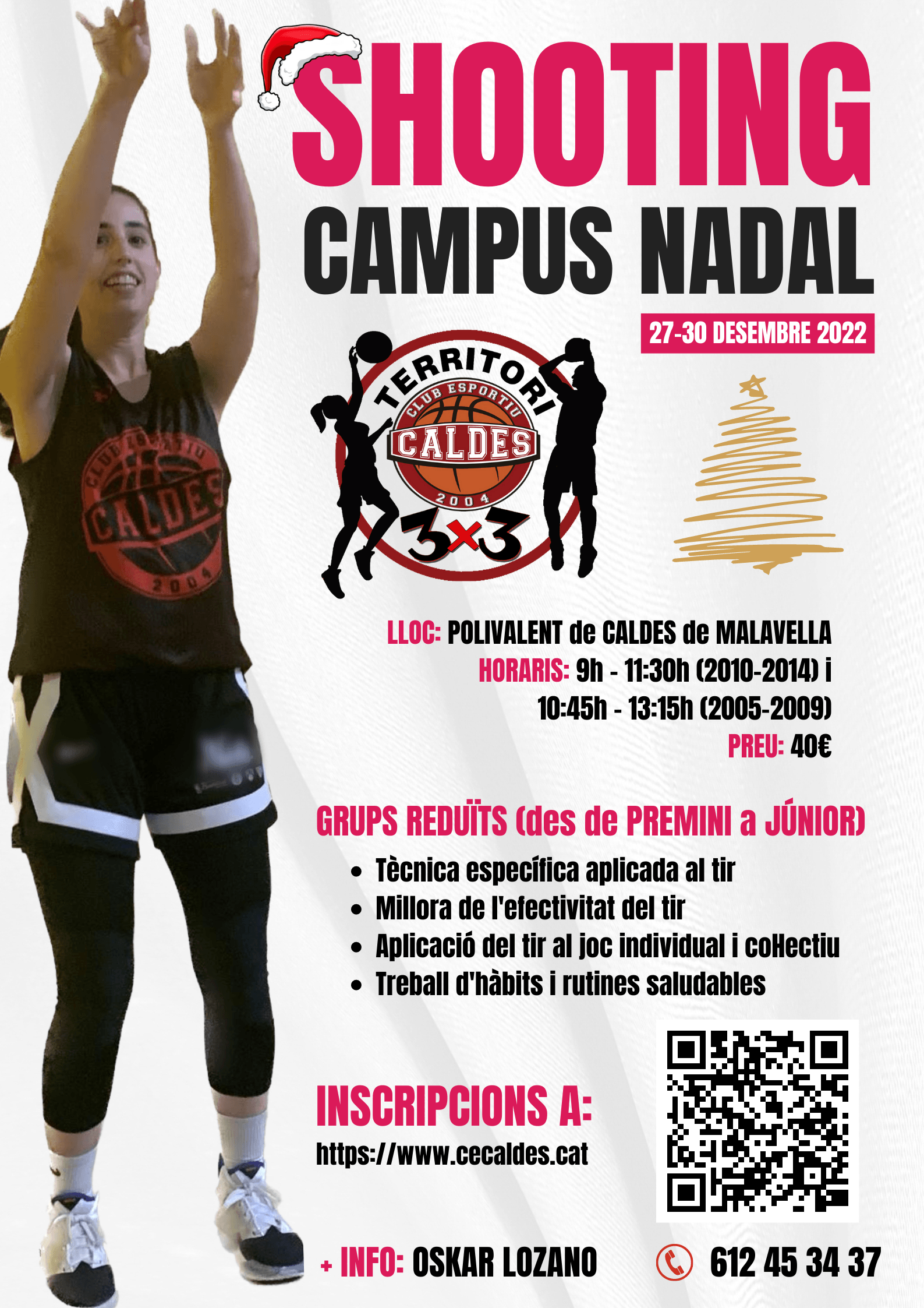 🏀 Territori 3x3 del CE Caldes us proposa per aquest Nadal uns entrenaments en grups reduïts per la millora o la consolidació del tir, ja que està adreçat tant a infants que no tenen una mecànica consolidada com els que volen realitzar un treball més específic. 👓 Sota la direcció esportiva de l'Oskar Lozano, i acompanyat d'altres tècnics i jugadors/es del club, es realitzarà un treball enfocat a la millora del tir (coordinació, mecànica, presa de decisions, aplicació, efectivitat) més un treball d'hàbits i rutines saludables. ⏳ Es proposa dues franges horàries: 🕘 Pilota nº5 (infants nascuts entre 2010 i 2014) de 9h a 11:30h 🕚 Pilota nº6 o 7 (joves nascuts entre 2005 i 2009) de 10:45h a 13:15h 📝 El preu del campus és 40€ (el pagament es farà en efectiu el primer dia de participació) i a sota teniu l'enllaç per poder fer la inscripció: https://www.cecaldes.cat/shooting-campus-de-nadal