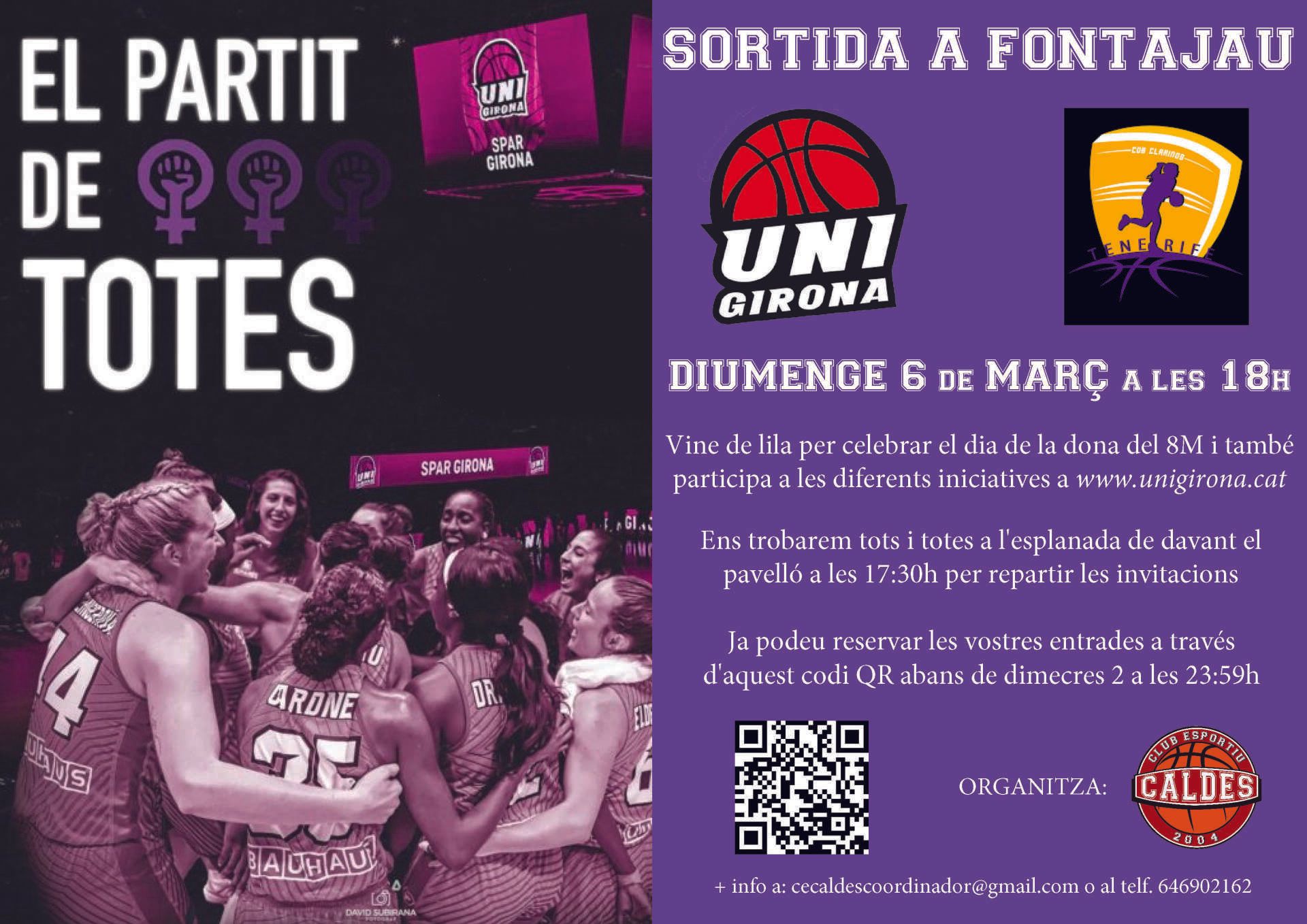 3x3Caldes - Sortida partit Lliga Femenina de bàsquet ! Després de l'anul·lament de l'anterior sortida, des del club us plantegem una nova data amb l'objectiu de continuar fent teixit associatiu i bàsquet, però també se'ns adhereix les diferents iniciatives de l'UniGirona pel dia de la dona. A continuació us adjuntem dos enllaços d'aquestes iniciatives: 👉 https://www.unigirona.cat/index.php/consulta-popular-el-partit-de-totes-6-de-marc/ 👉 https://www.unigirona.cat/index.php/disponible-la-samarreta-del-dia-internacional-de-la-dona-2/ ✅ Podeu demanar les vostres entrades de forma gratuïta ABANS de DIMECRES 2 de MARÇ a les 23:59h a: 👉 https://ja.cat/GVpU6 o podeu accedir-hi ràpidament amb el QR que trobareu al cartell.